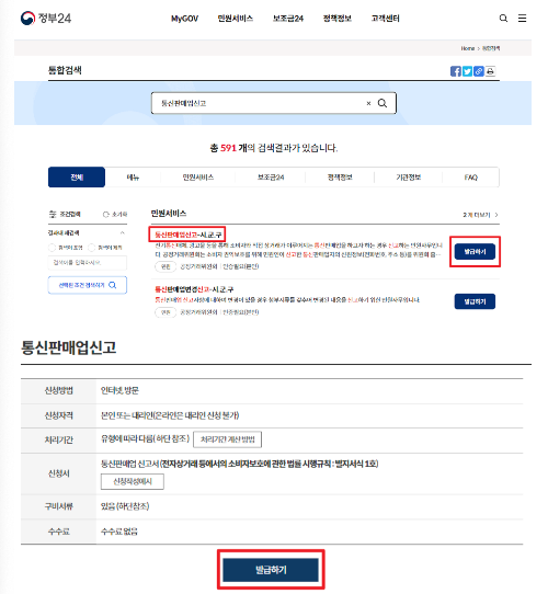 민원서비스 란에 [통신판매업신고-시,군,구] 를 선택하시고 오른쪽 발급하기를 눌러주세요.