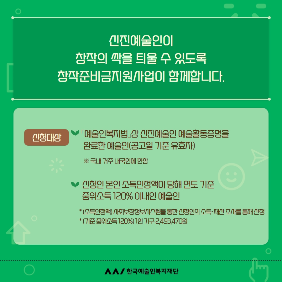 - 소득인정액*이 당해 연도 기준 중위소득 120%* 이내인 예술인