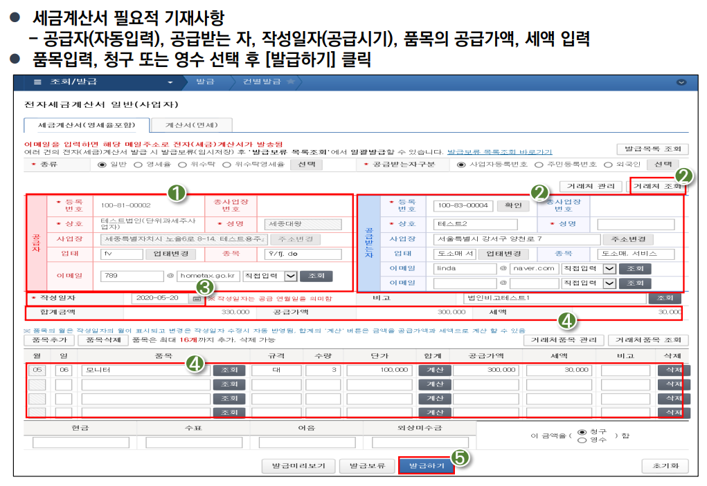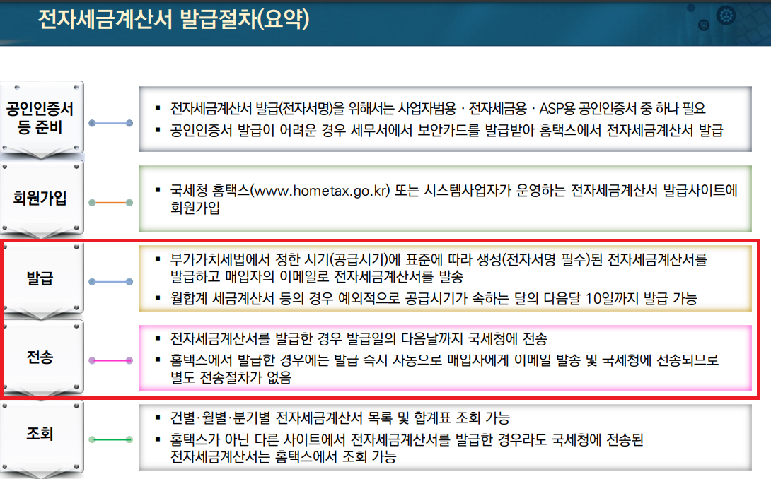 부가가치세법에서 정한 시기에 표준에 따라 생성(전자서명 필수)된 전자(세금) 계산서를 발급하고, 매입자의 이메일로 전자세금계산서 발송 합니다. 월합계 (세금)계산서 등의 경우 예외적으로 공급시기가 속하는 달의 다음달 10일까지 발급 가능